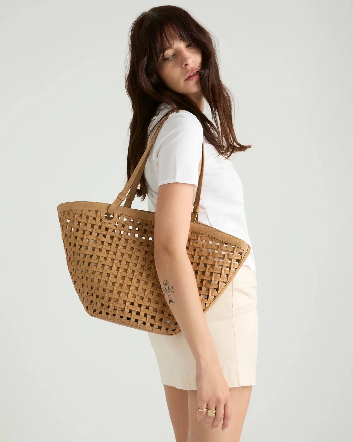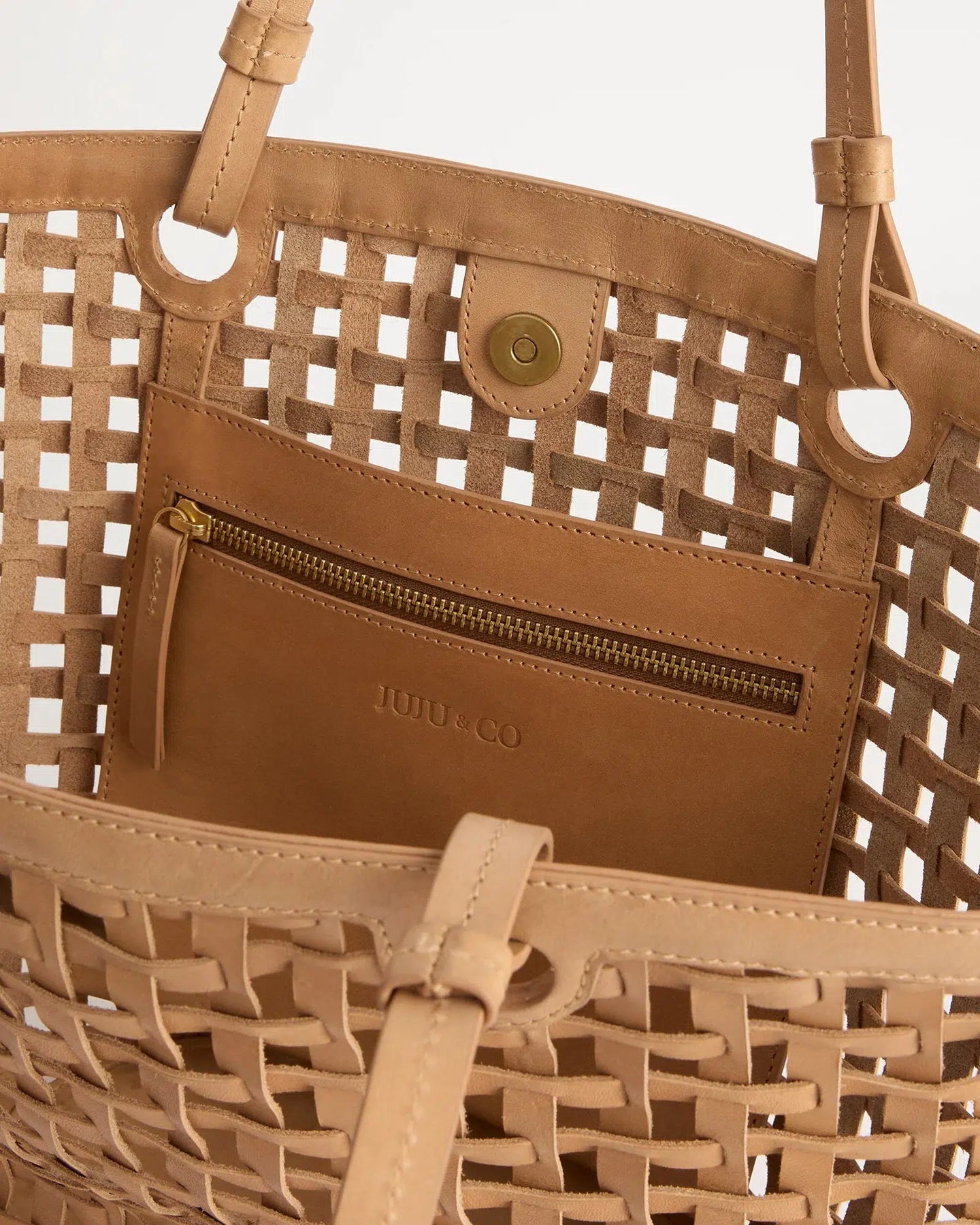 Woven leather design crafted from our premium leather. Featuring an internal zip pocket and magnetic closure, making it the ideal bag for beach days and markets.