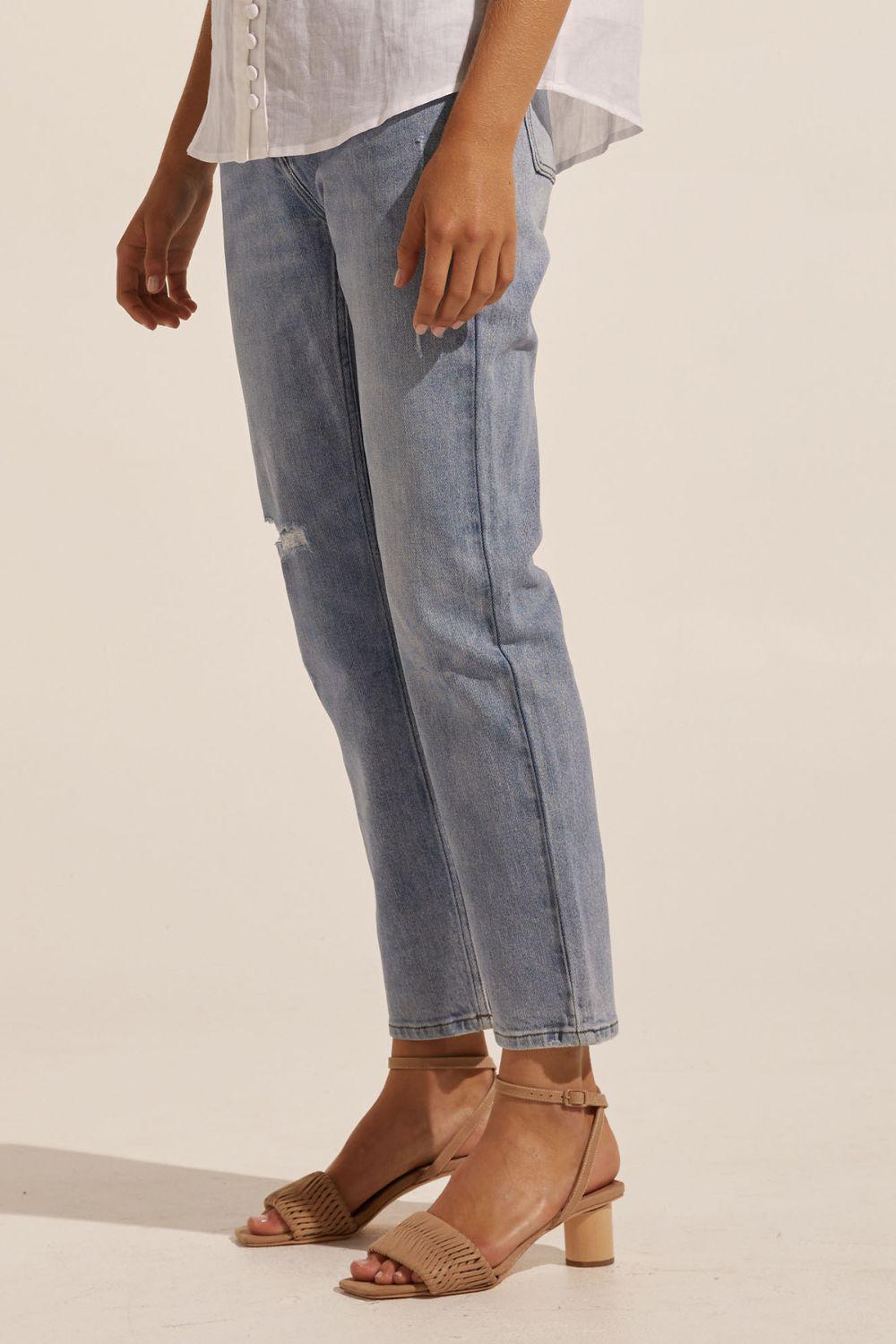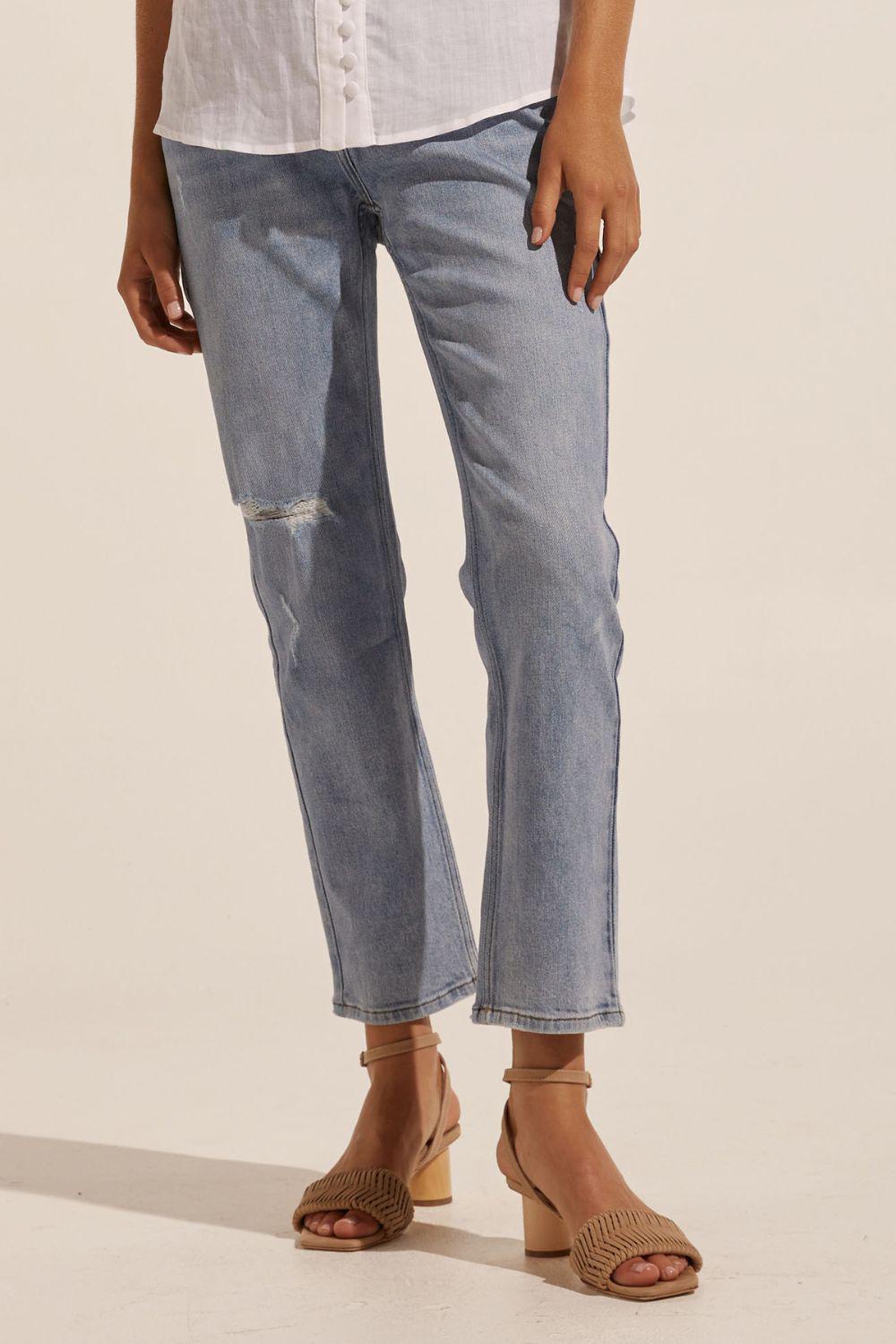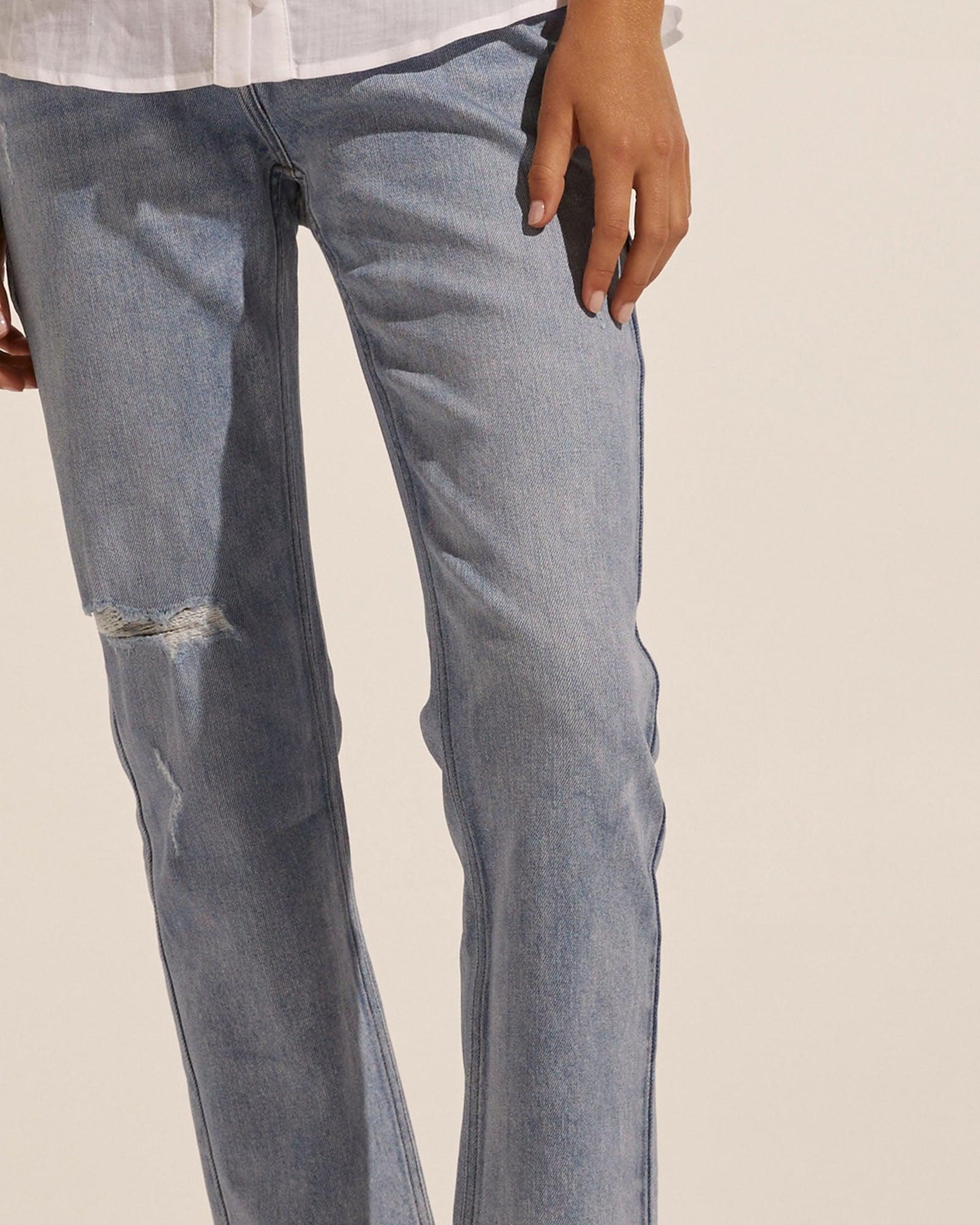 React Jean - a sophisticated take on the classic distressed denim jean. Featuring a mid-rise cut, straight leg style, functional side pockets and belt loops, with an all over comfortable stretch fit.