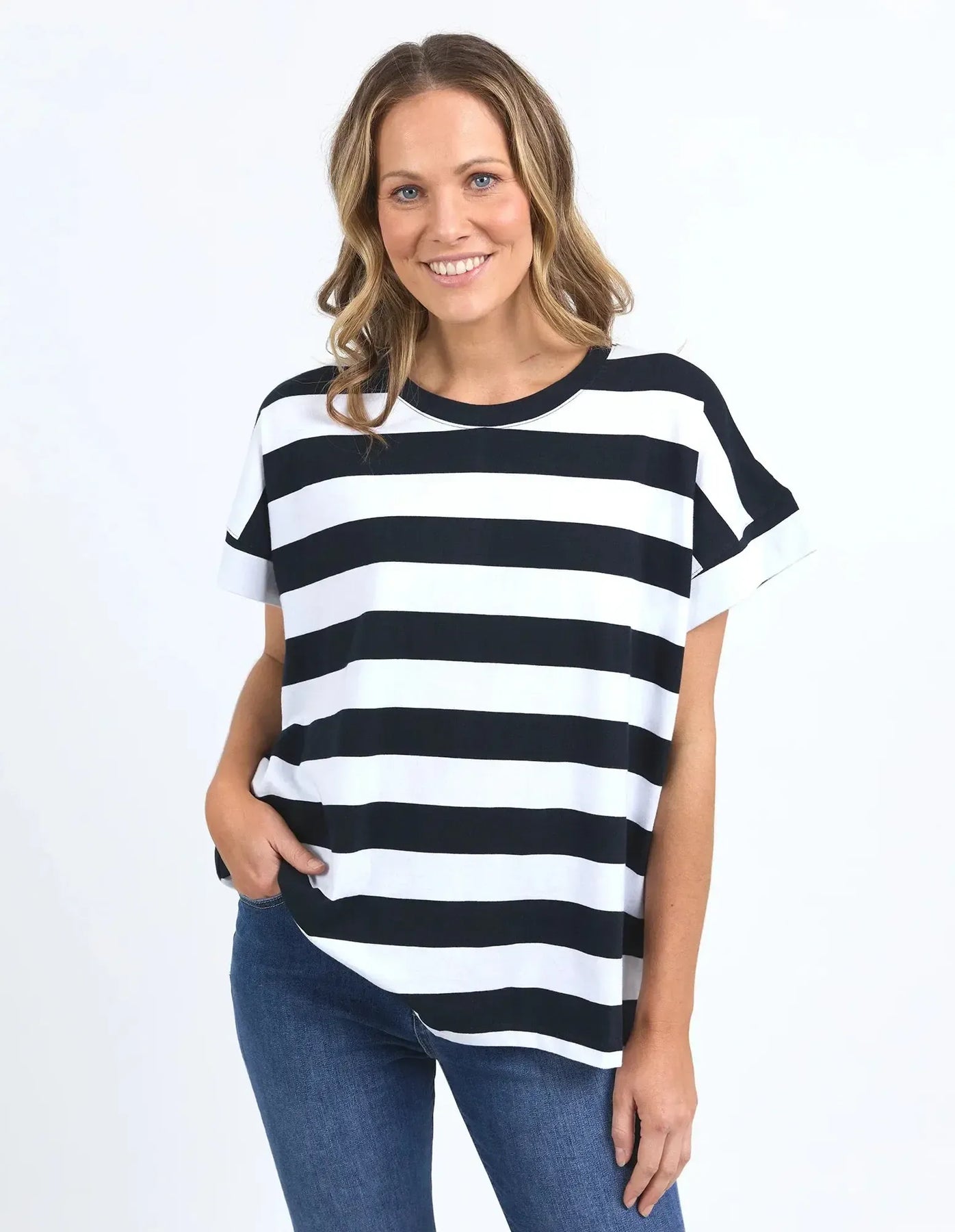 The Mckinley Tee featuring in Navy and White Stripe with a gorgeous button placket at the back of tee, with a round neckline, with a drop shoulder and a cuffed sleeve, the hemline being slightly longer at the back.
