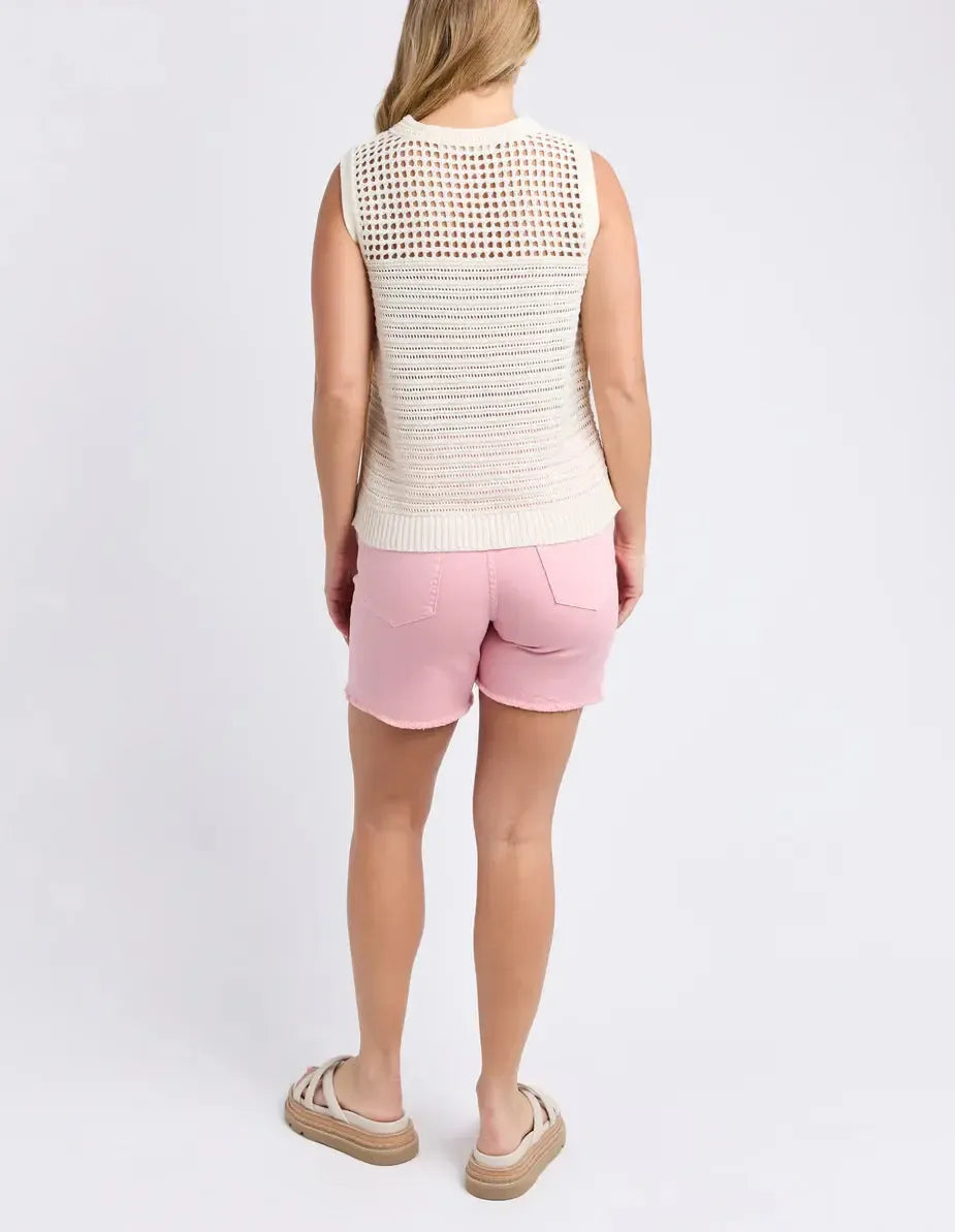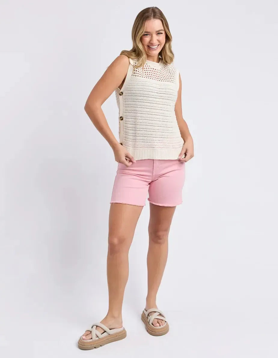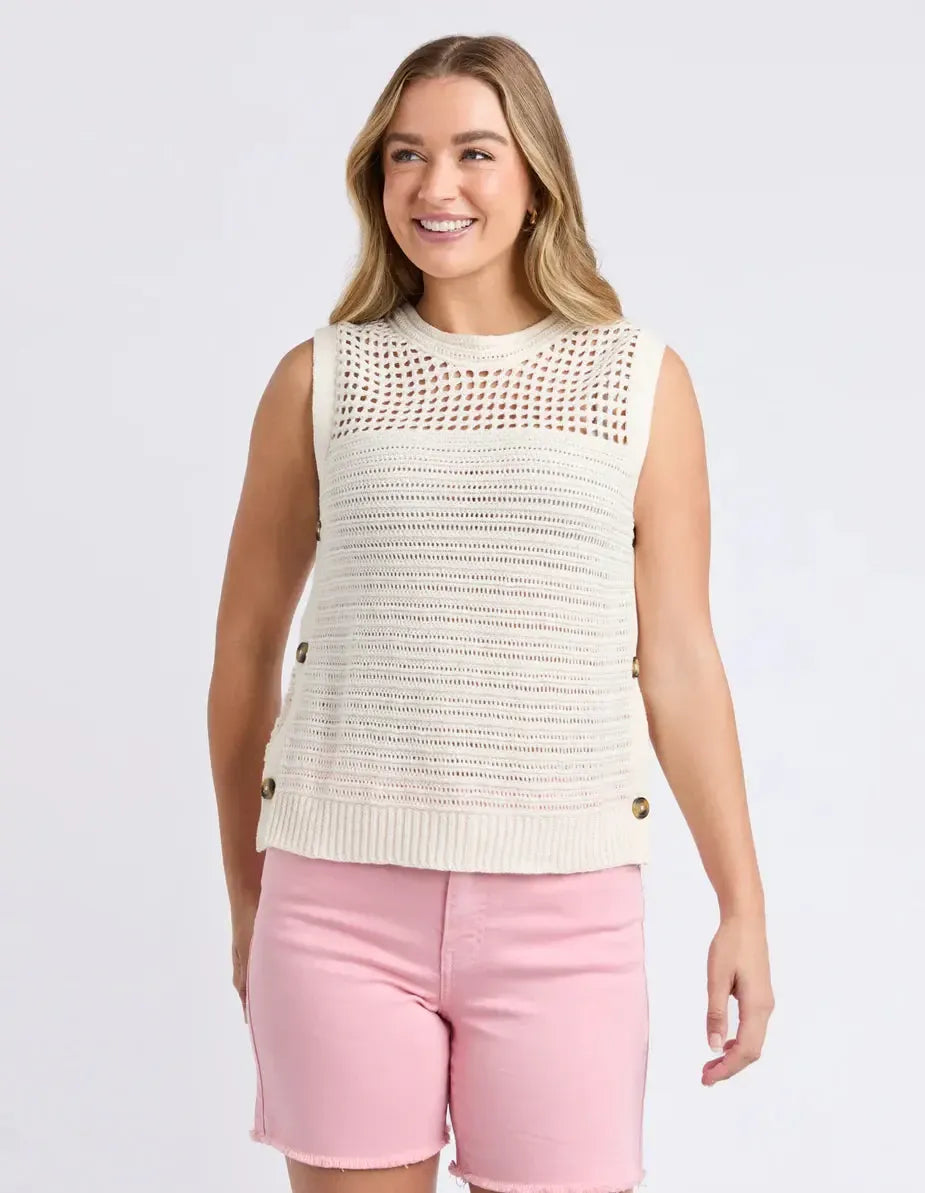 The Chilli Knit Top is a fresh twist on layering with its open-stitch design, sleeveless cut and button detail at the sides. Light and airy, it is the perfect piece to throw over tanks, dresses or swimwear for an easy summer vibe.