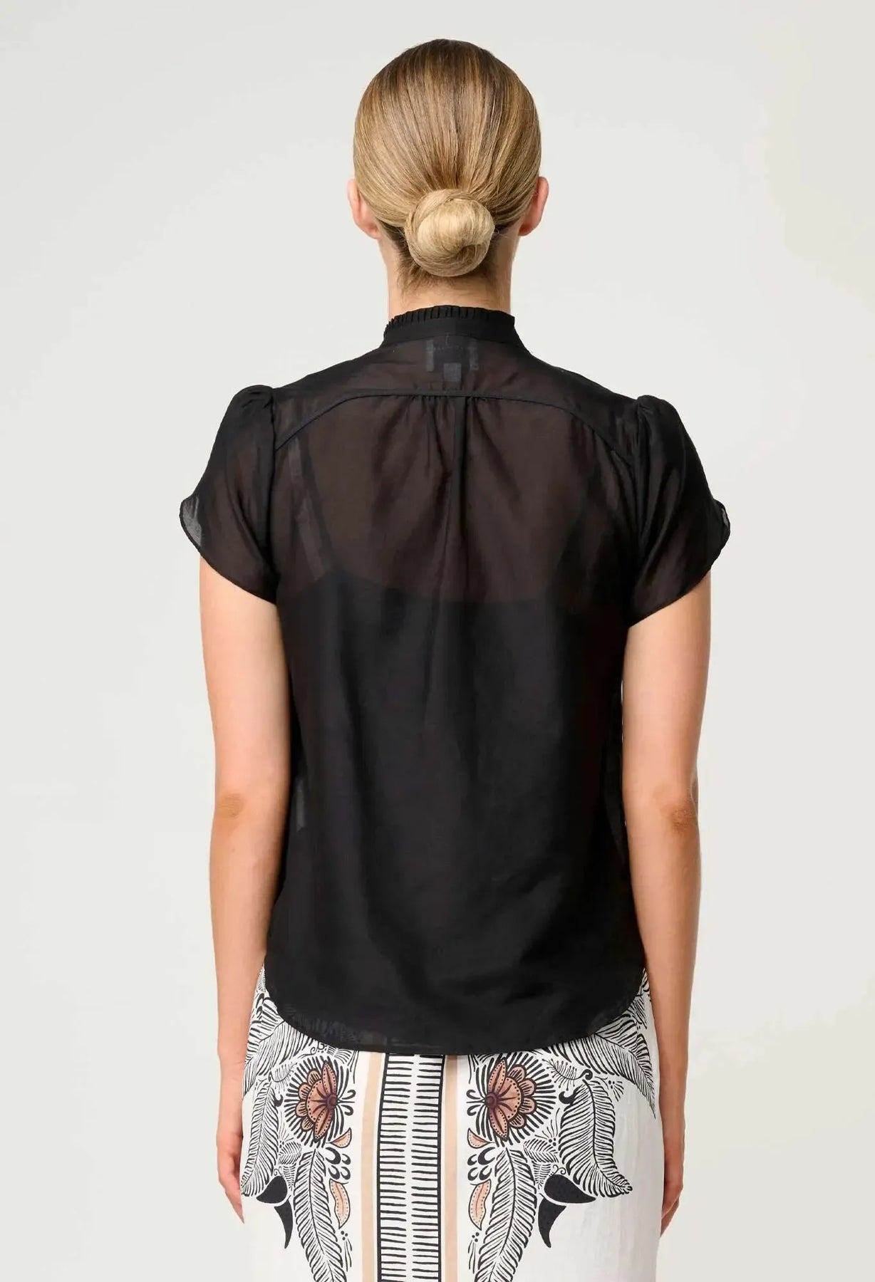 Crafted from a luxurious silk cotton blend, this piece combines the lightweight breathability of cotton with the subtle sheen of silk. The intricate diamond smocking detail across the yoke adds a touch of texture and craftsmanship, creating a striking focal point against the deep onyx hue. Softly structured flutter sleeves lend movement and femininity, while the button-through front ensures effortless styling versatility.