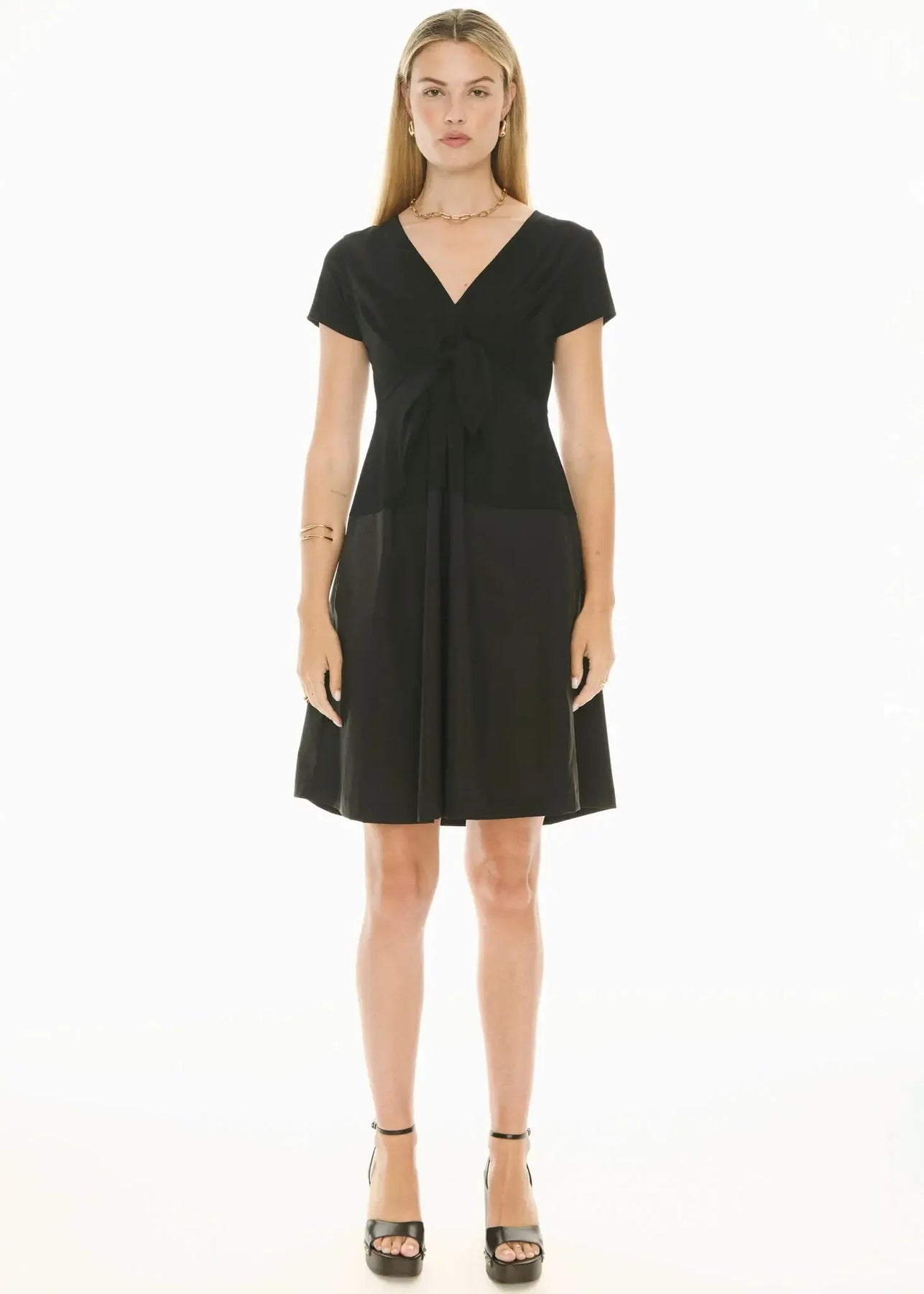 -V-neck with knot detail and gathers can be worn to the front or the back.