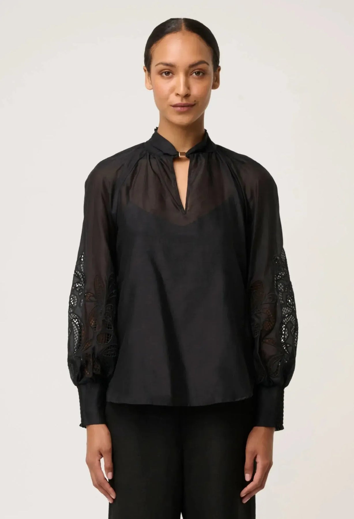 A softly gathered stand collar is finished with a refined gold metal detail at the neckline, creating a polished focal point that enhances the minimalist design. Voluminous long sleeves with embroidered panels and cuffed hems bring balance and femininity, while the relaxed fit ensures comfort without compromising elegance. Effortlessly versatile, the Simona Blouse pairs seamlessly with tailored pants, skirts, or denim for day-to-night styling.