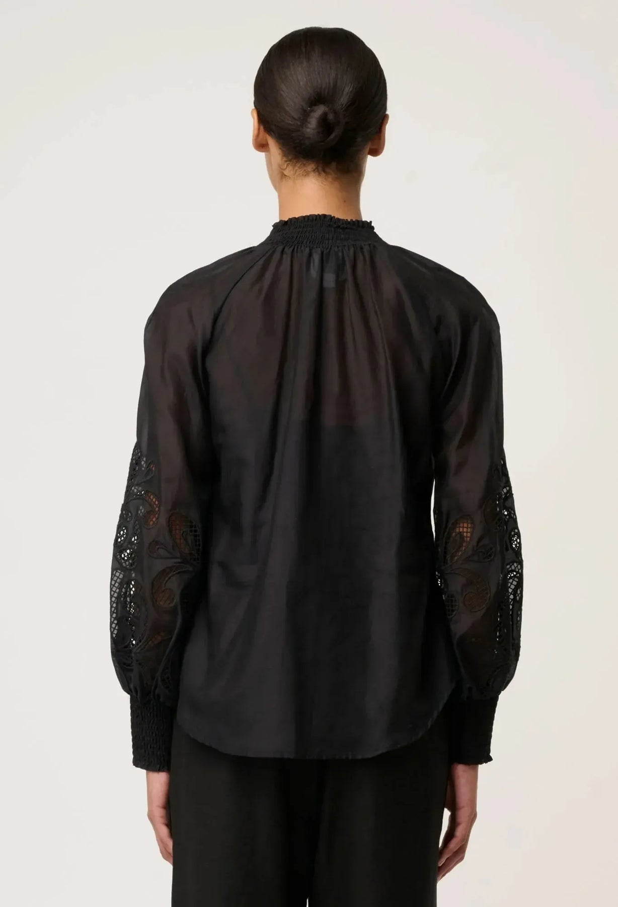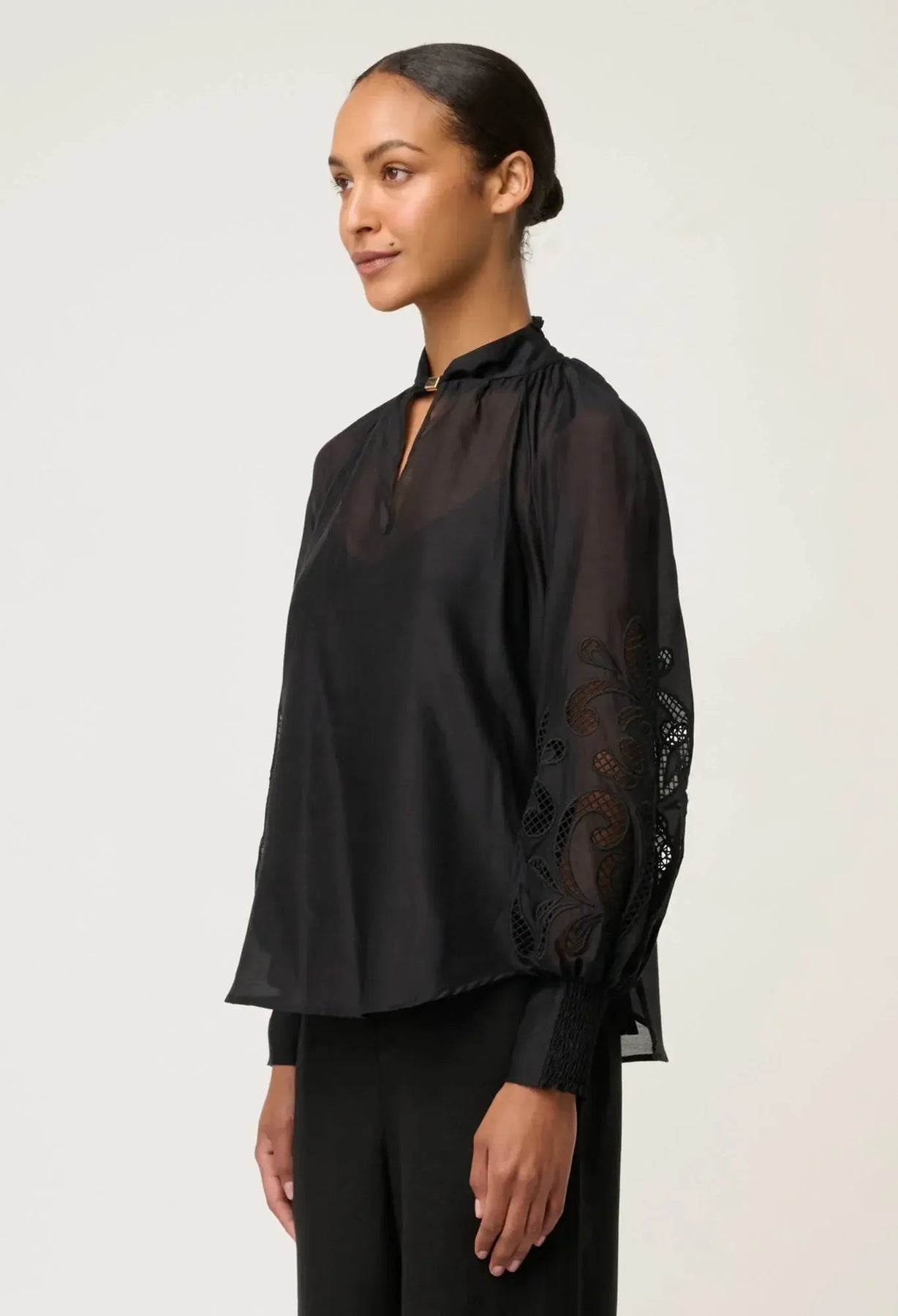 Elegant and timeless, the Simona Cotton Silk Embroidered Blouse in Black is a refined essential designed for elevated everyday and evening wear. Crafted from a luxurious cotton-silk blend, this blouse offers a lightweight, softly sheer finish with a beautiful natural drape. The clean silhouette is elevated by delicate embroidered detailing along the sleeves, adding artisanal texture and subtle sophistication.
