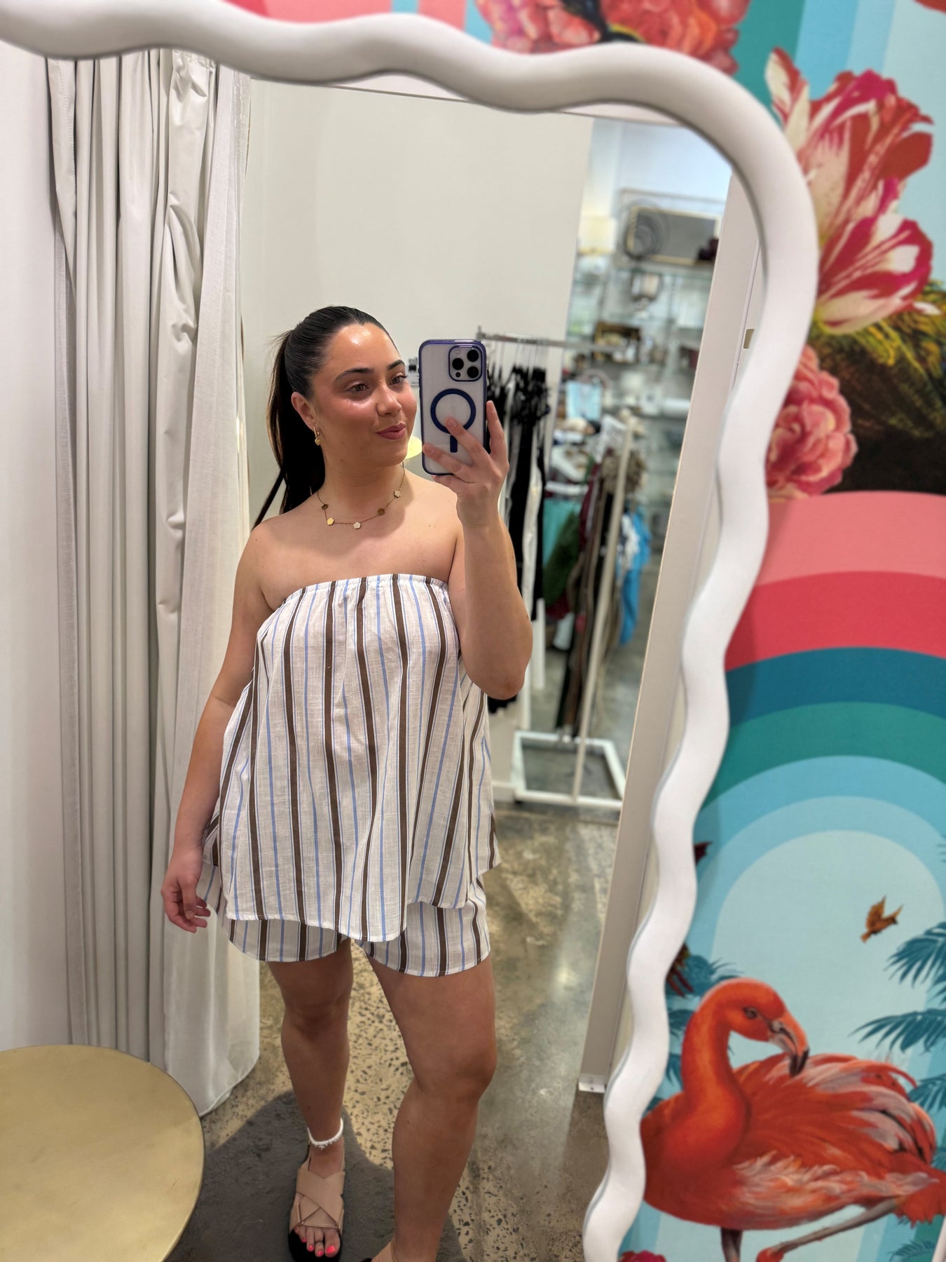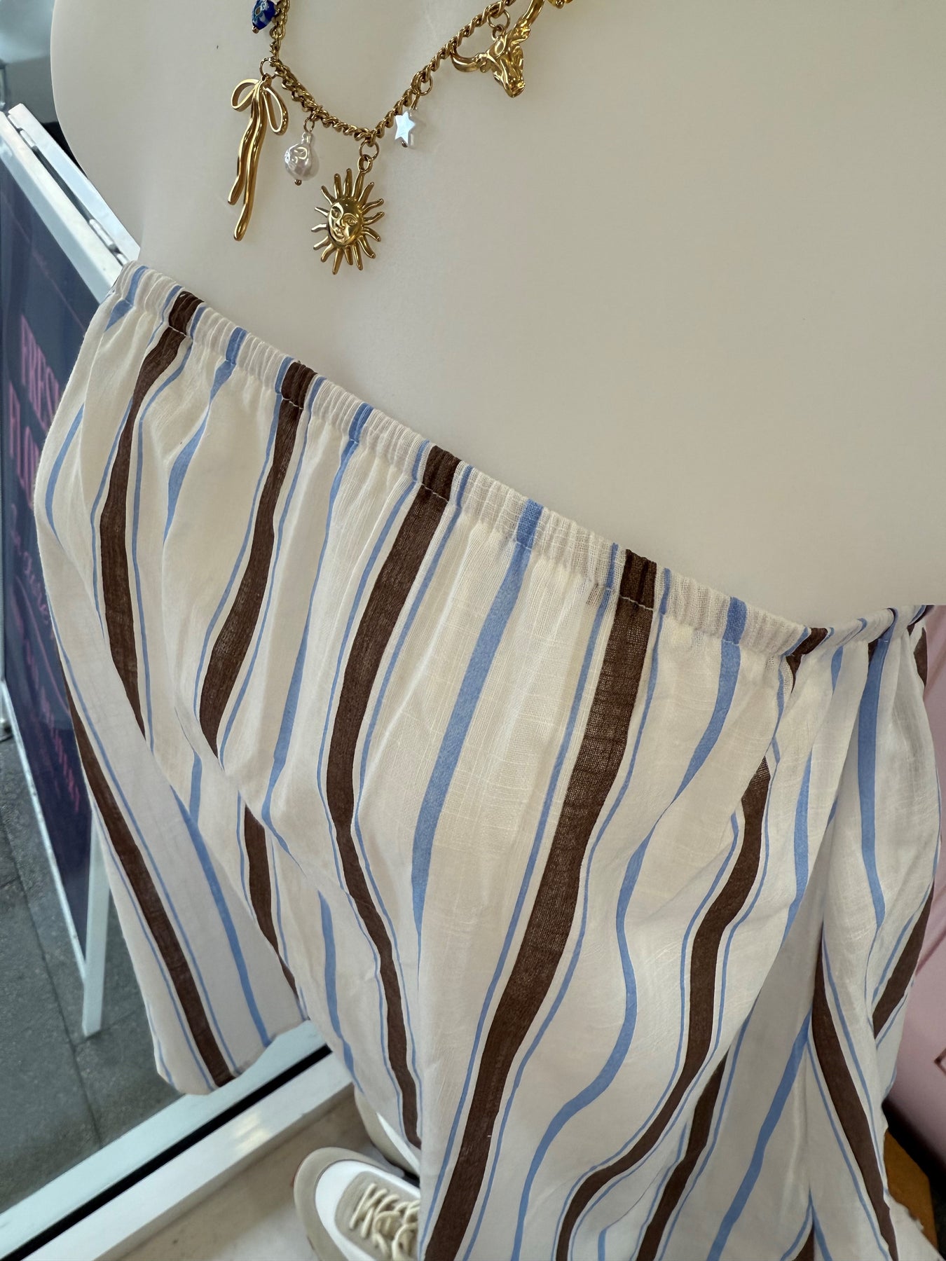 This effortless strapless top is crafted from 100% breathable cotton, making it a perfect choice for warm-weather styling. Featuring a soft neutral base with subtle vertical stripes, it offers a relaxed yet flattering silhouette that’s easy to wear. Lightweight and comfortable, this top pairs seamlessly with the matching shorts or your favourite denim for an elevated summer look. Designed to be true to size for an easy, comfortable fit.