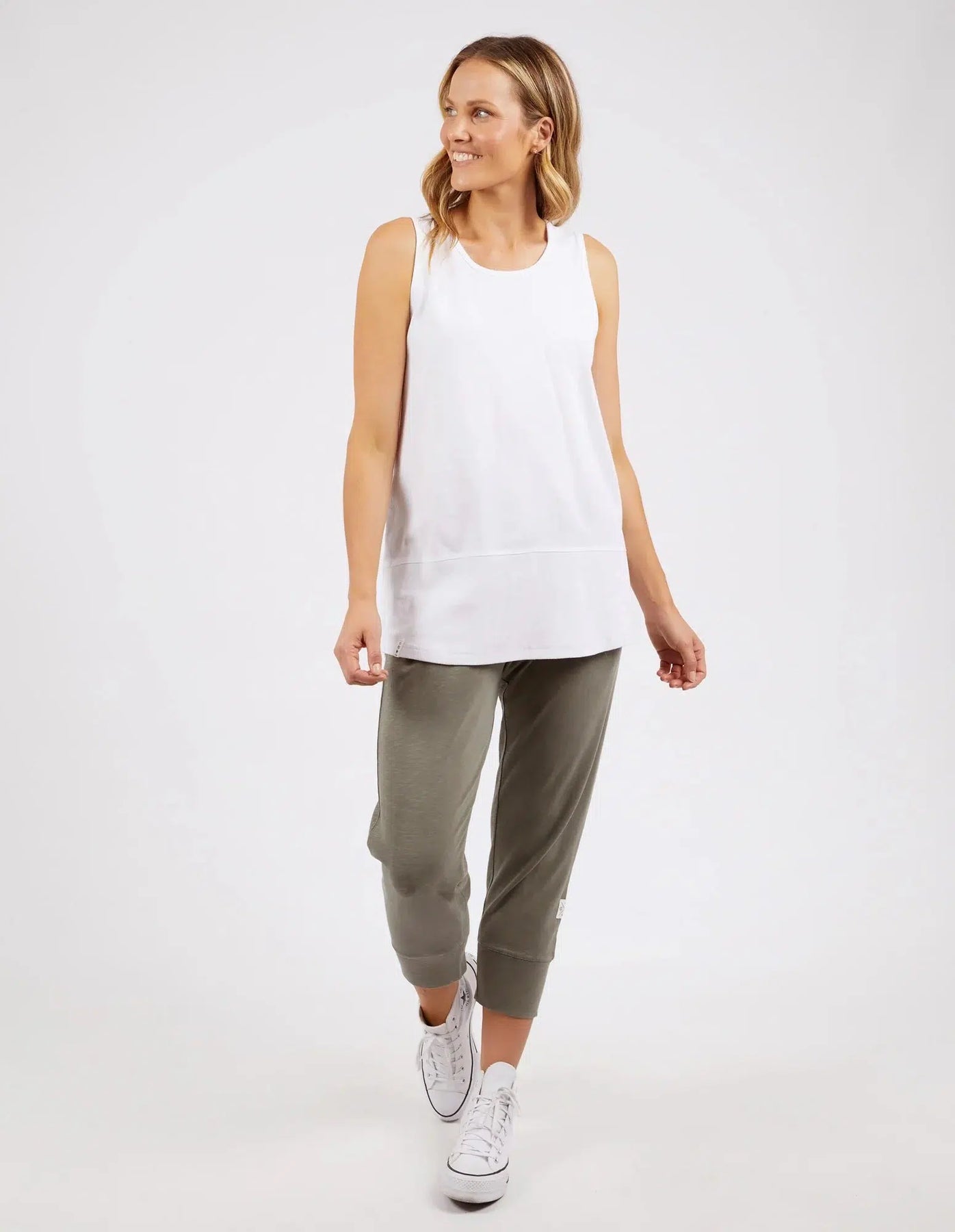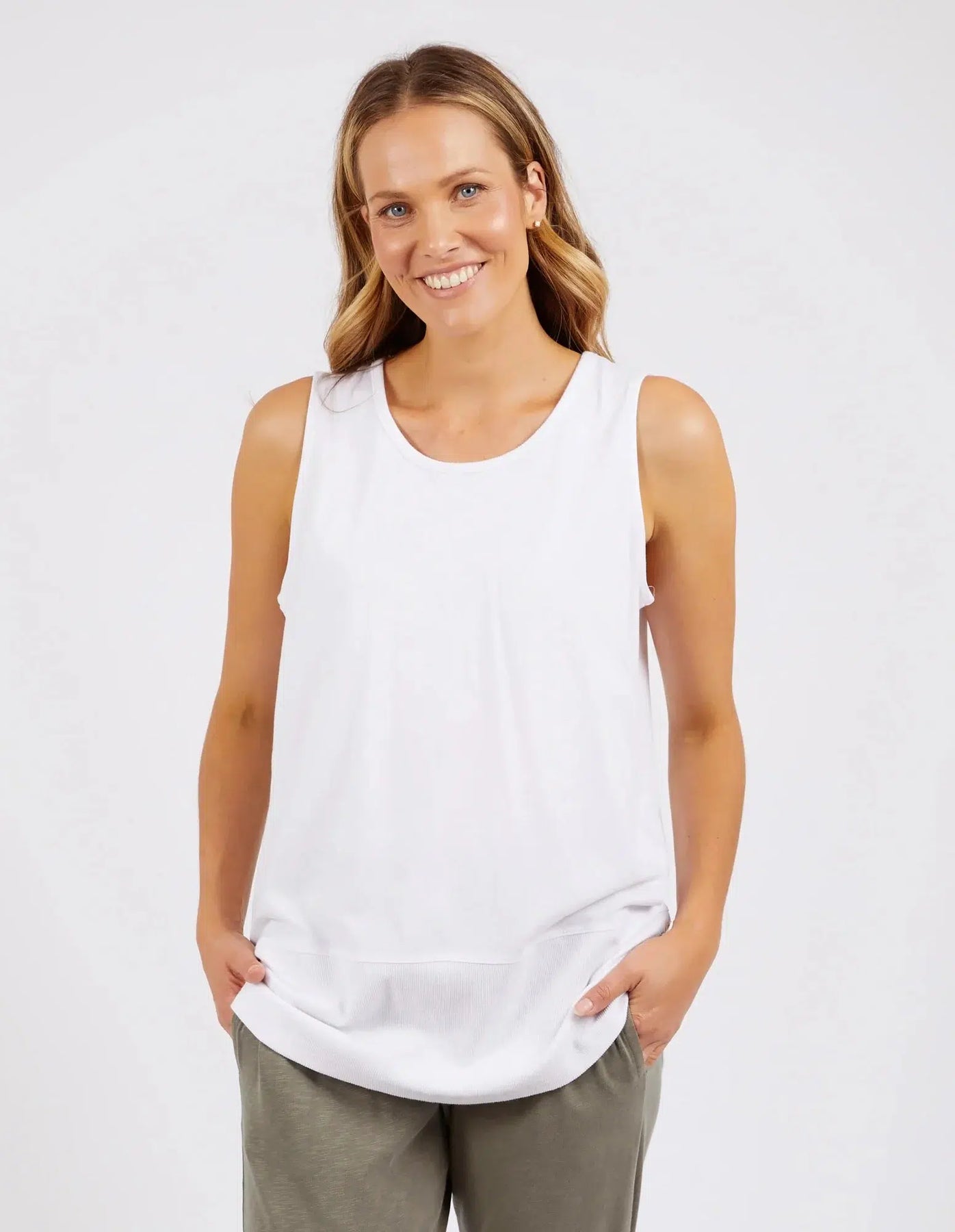 A classic Elm tank that takes things to the next level with a rounded high-low hem, round neckline, and rib panelling. Ideal for layering or wearing on those warmer days atop your favourite bottoms.