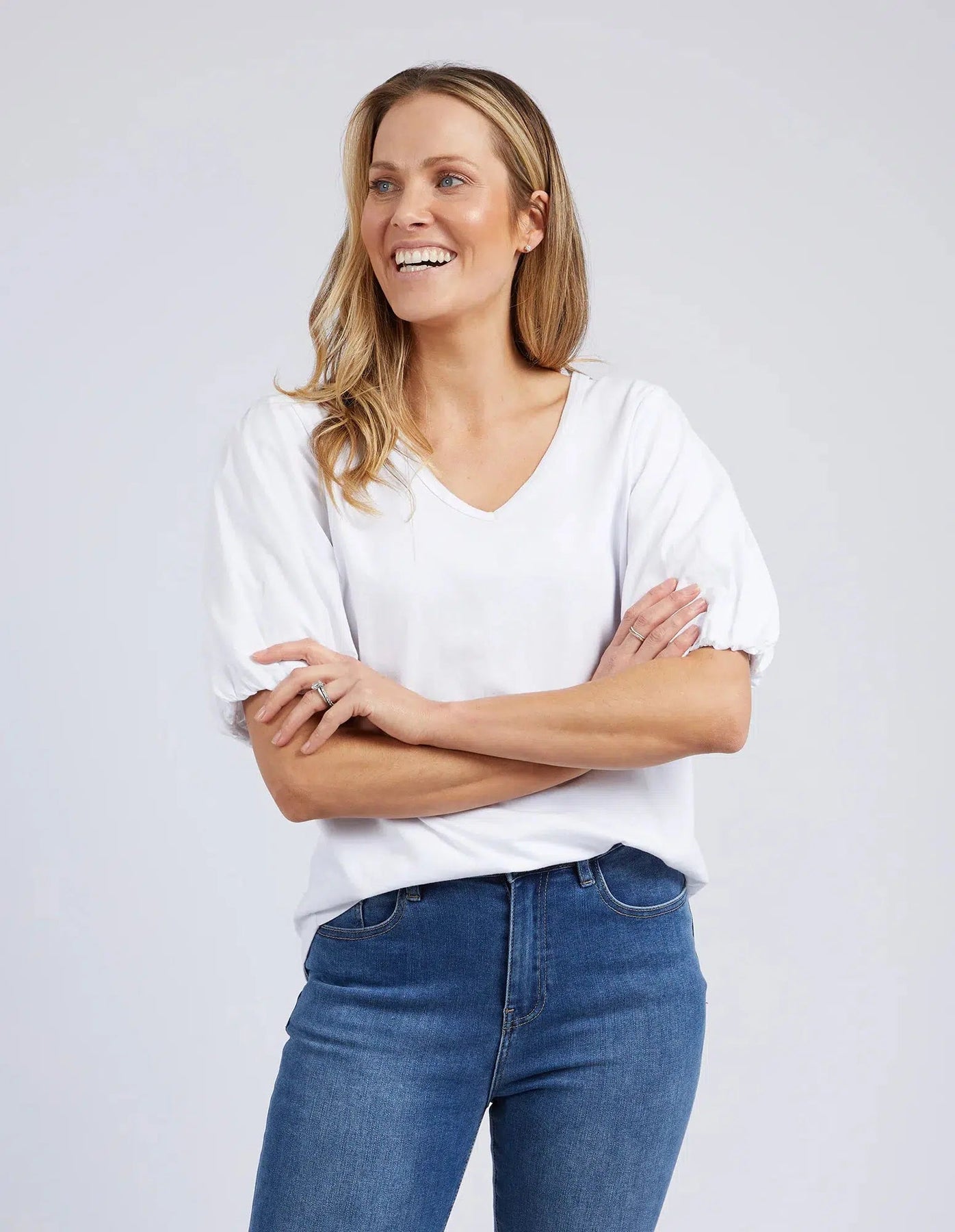 Joy S/S Tee - Your dressy tee! The Joy S/S Tee features a soft and flattering cotton elastane body section for comfort and the cutest women poplin sleeves for a touch of special. Featuring a heart embroidery on the front left hem with love from Elm.
