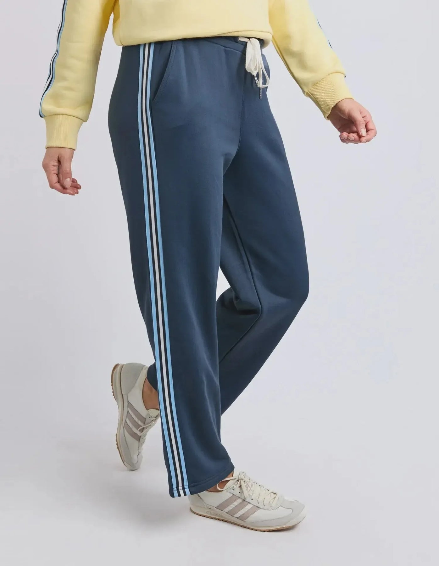Elevate your casual wardrobe with the Amara Trackpants in Navy. These versatile pants feature a comfortable straight leg silhouette that flatters every frame, paired with a practical elasticated waist and adjustable tie front for the perfect fit. Eye-catching stripes run down each leg, adding a sporty edge that transitions seamlessly from gym sessions to weekend errands. Whether you're prioritising comfort or style, the Amara delivers on both fronts—a wardrobe essential that works as hard as you do