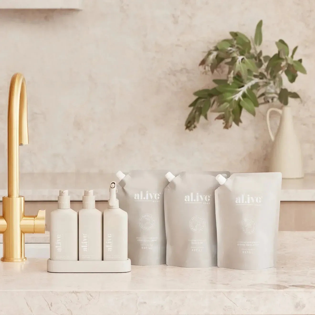Our refill pouches use 85% less plastic and refill your 300ml al.ive body bottle three times.