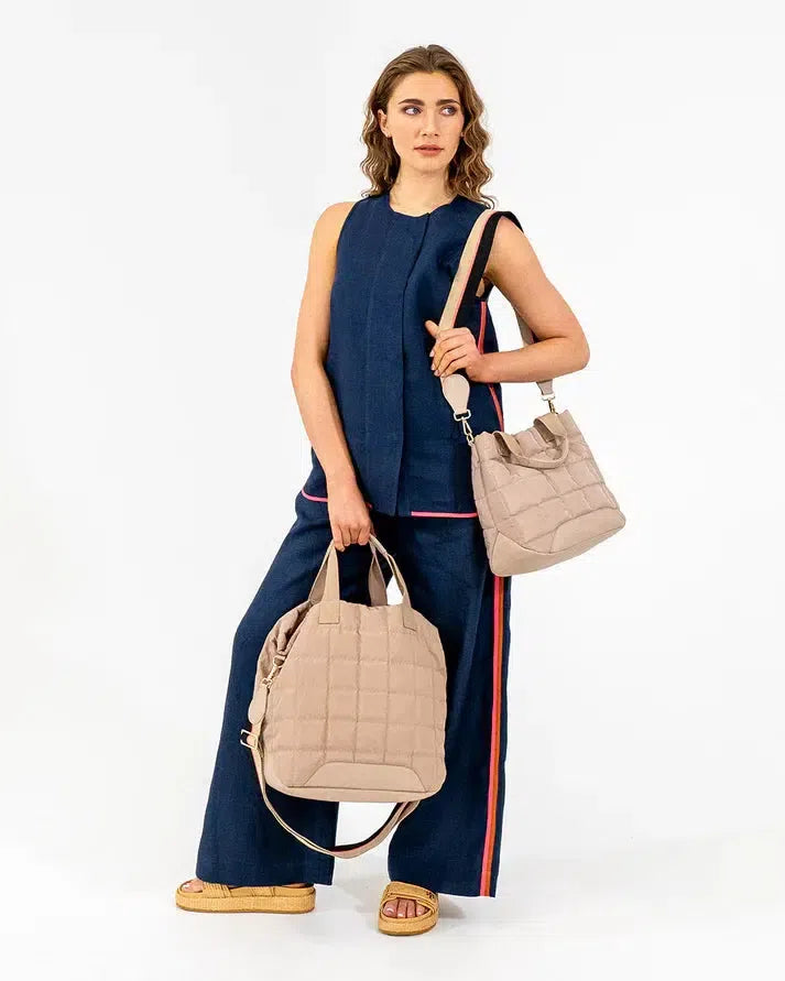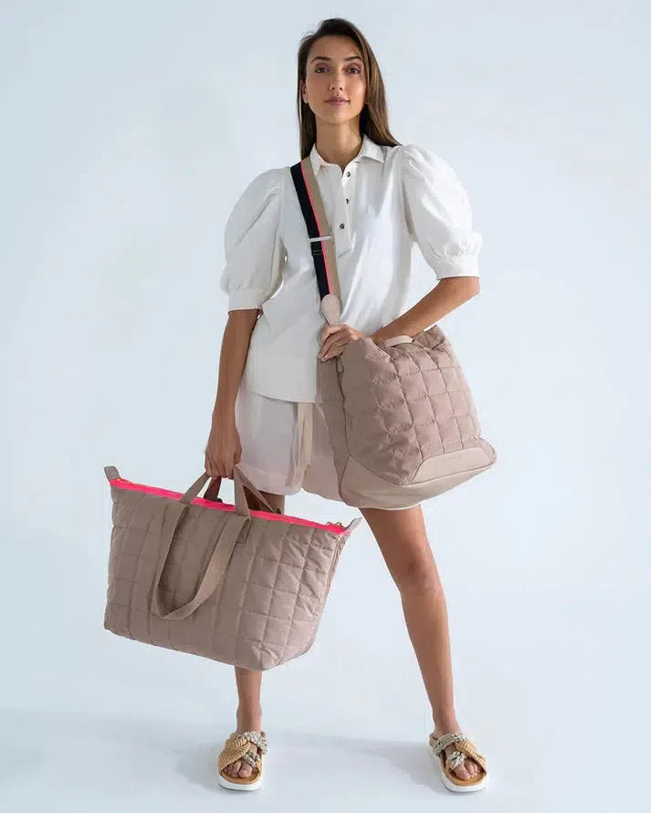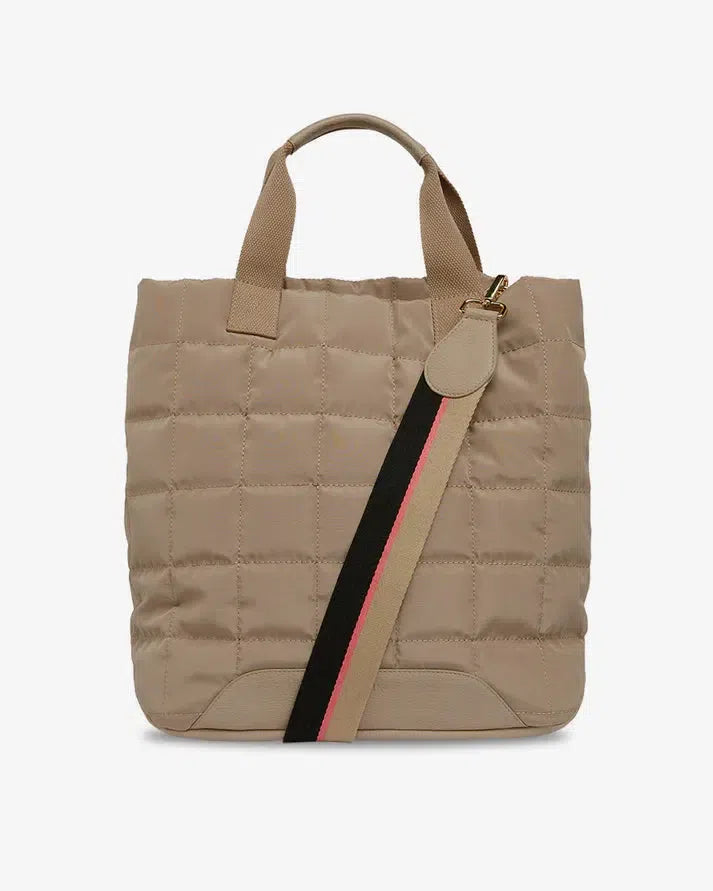 The Elms and King Santa Monica Tote is bucket-style tote. The tote features a centre buckle closure, and interior detailing to hold all your essentials. With handy top grip handle, plus a removable crossbody strap, whether your day starts at the gym, or out & about, the Santa Monica has you covered. Made from premium quilted nylon, the Santa Monica Tote features a bright pop nylon lining.